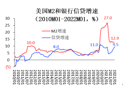 第二,超级量宽政策带来美联储资产负债表前所未有扩张和流动性极为宽裕,刺激疫情期美国广义货币激增与信贷显著增长,成为助推需求扩张加剧通胀压力的货币条件。2020年3月以后到2022年初,美国广义货币M2月度同比增速均值飙升到超过18%,约为2010-2019该指标值的三倍。同期美国贷款月度同比增速约为8%,接近2010-19年该指标值的两倍。货币信贷快速扩张也对供给复苏产生积极作用,然而总体对需求增长产生较大影响并助推通胀。