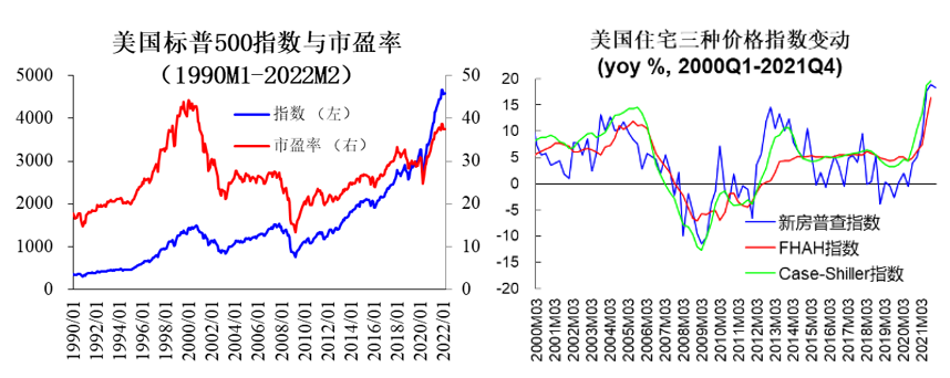 第三,流动性和货币供给超常增长,加上白宫财经团队核心成员摩拳擦掌要“大干一场”(go big!)表态助力,货币政策强化量宽和零利率不设截止期等政策引导加码,促使美国主要资产价格大幅飙升并通过财富效应进一步助推需求增长和通胀。下面左图数据显示,标普500疫情初期一度恐慌式急剧下挫后很快强劲反弹和持续增长,从2020年初3200点飙升到2021年底4670点以上,增幅高达46.7%,其市盈率也达到2000年股市泡沫破灭以后的新高。下面右图显示的三种房价指数从2020年下半年以后齐头并进直线上升,2021年第4季度同比增速全面超过新世纪初年次贷危机前的峰值。