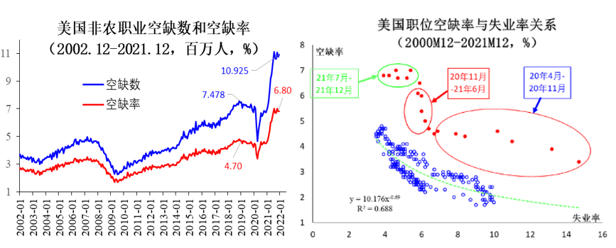 第四,超常收入补贴对疫情期民生纾困带来积极成效同时,也在一些场合对劳动力供给造成边际制约并在客观上增加通胀压力。美国宏观经济快速复苏阶段,部分生活服务、休闲娱乐等劳动密集性行业持续面临劳动力供不应求困扰。这一现象部分成因确实与疫情不对称冲击有关,另外大规模补贴改变激励机制和人们行为也有一定作用。劳动力供给因为疫情和政策双重因素制约难以充分恢复,导致美国劳动市场出现反常现象。例如下面左图数据显示美国非农职业空缺数与空缺率在劳动市场尚未充分就业前不断攀升到罕见高位。右图显示空缺率与失业率关系即贝弗里奇(Beveridge)曲线形状,在2020年底到2021年上半年出现极为陡直的反常状态。