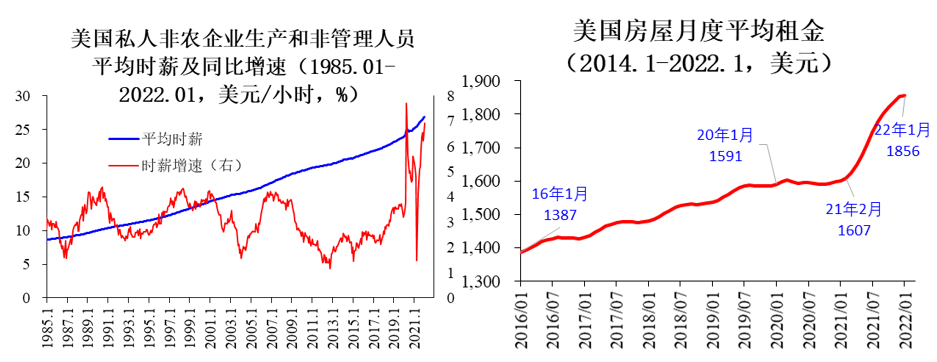最后,与通胀预期密切相关的工资和房租等不可贸易品价格大幅上涨。依据下面左图数据,2020年4月到2022年1月美国私人非农企业的雇员小时工资平均增速为5.3%,大幅高于该指标在1990-2019年的均值3.0%以及2010-2019年均值2.4%。右图数据显示房屋平均租金2020年小幅增长约1%低于疫情前增速,然而2021年大幅飙升:在2021年2月到2022年1月一年内增幅高达15.5%,超过疫情前三年(2016-2019)累计增速14.7%。房租与工资价格形成往往要借助跨年度合约实现,二者大幅增长不仅助推当期通胀压力增加,而且可能引入通胀螺旋上升风险。