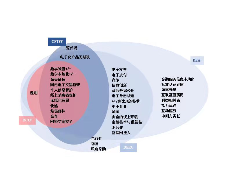 多边自由贸易安排中的数字贸易。数字贸易规则被纳入双边、多边自由贸易安排,既是货物贸易规则磨合的延伸,也由于机制所限,世贸组织框架下的数字经贸规则无法及时更新。近年来贸易活力增长迅速的亚太被认为是最有希望影响相关规则建设进程的地区。 目前,《区域全面经济伙伴关系协定》(RCEP,2022年1月生效)和《全面与进步跨太平洋伙伴关系协定》(CPTPP,2018年生效)都包括数字贸易章节。而新加坡和澳大利亚的双边数字经济协议(DEA,2020年生效)和《数字经济伙伴关系协定》(DEPA,2021年生效)则专注数字贸易规则的更新。虽然DEPA的正式成员国只有新加坡、新西兰和智利,但它对其它国家开放,也允许新的成员国选择性地接受协定中的条款。中国在2021年正式申请加入CPTPP和DEPA。