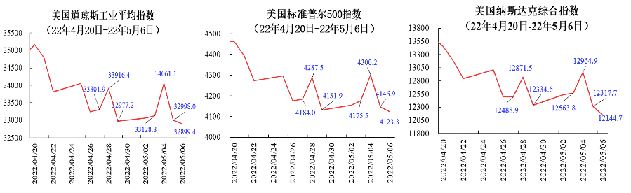 结果4月28日在上述超预期负增长数据公布当天,伴随美元走强和收益率上升,又得到部分重要上市公司盈利较好表现加持,美国三大股指全面大幅上涨:纳斯达克指数、标准普尔500和道琼斯平均工业指数,该日分别录得3.1%、2.5%和1.9%显著增长。但是次日股市转而大幅下跌:标准普尔500降低155.57点到4,131.93点,跌幅为3.6%,4月整体下跌8.8%,成为2020年3月以来表现最差月份;道琼斯指数下跌939.18点至32,977.21点,跌幅为2.8%,4月跌落4.9%;纳斯达克指数丢失536.89点到12,334.64点,跌幅为4.2%,4月跌落13.3%,今年前4个月已经累计下跌21.2%。