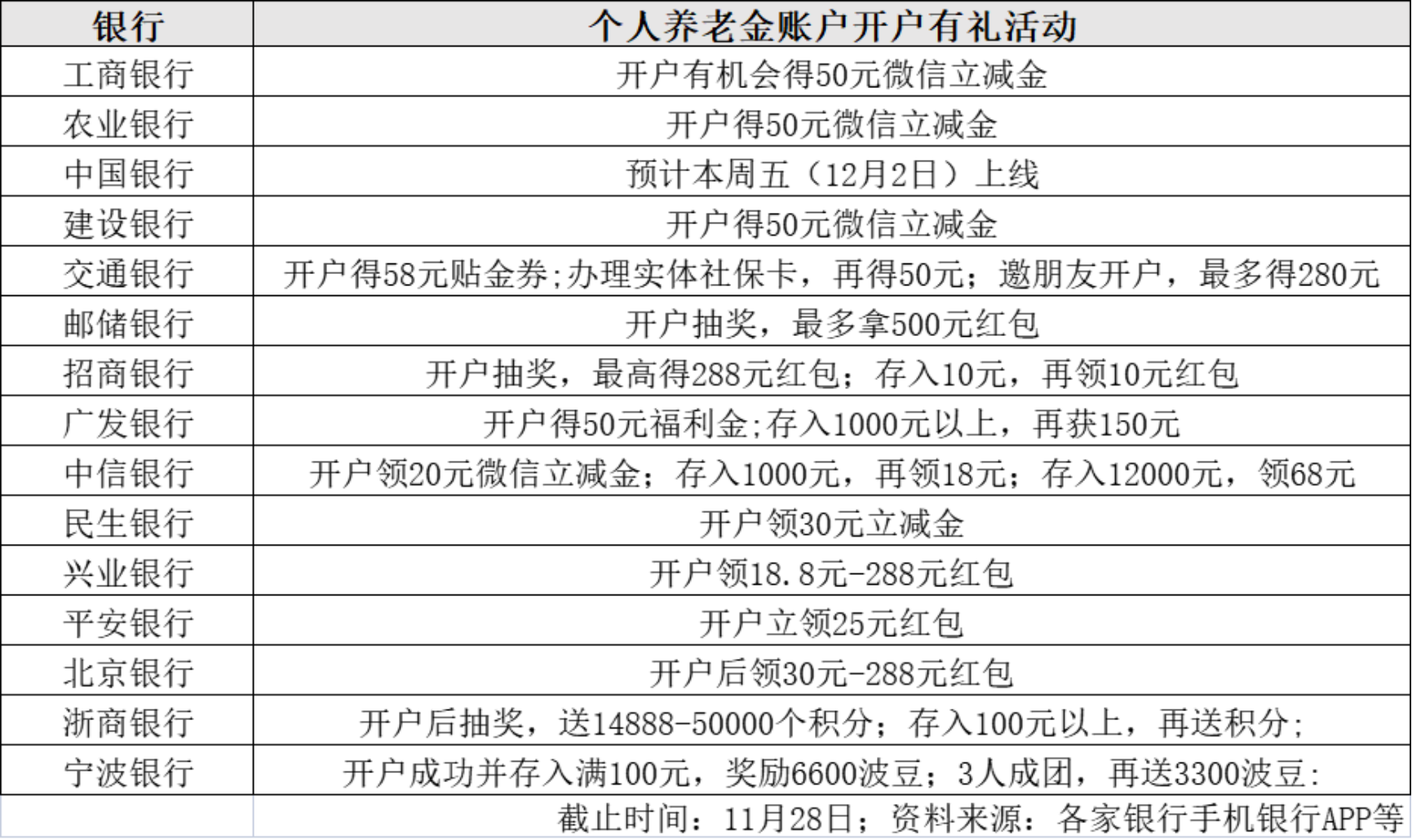 首先,参加人需要到商业银行开立个人养老金资金账户,并且这个账户是唯一性的,虽然《实施办法》规定“参加人可以在不同商业银行之间变更其个人养老金资金账户”,但是,考虑到具体操作流程及时间效率等因素,一般普通投资者很少变更其资金账户。而商业银行具有庞大的客户基础和网点体系,可以通过开立个人养老金资金账户加强和客户的联系,做好客户的服务工作,增加客户的黏度等,近期,很多商业银行已经通过各种线下和线下渠道及开展各种“开户有礼”等活动来抢占个人养老金资金账户开户的先机,目前各家银行发布的开户有礼活动主要统计如下: