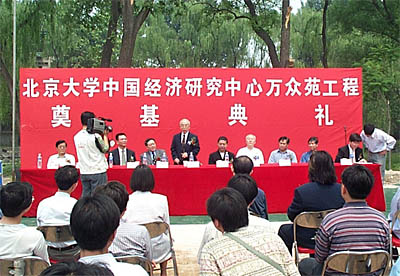 由台湾亚陆投资股份有限公司万众先生捐资兴建的北京大学中国经济研究中心“万众苑”工程,在北京大学、北京市文物局、文物工程处、北京市古建设计所等单位各级领导的支持帮助下,于2000年5月24日上午在经济中心举行了开工典礼。典礼仪式由经济中心常务副主任海闻教授主持,经济中心主任林毅夫教授致开幕词,北京大学副校长何芳川先生、北京大学万众苑工程捐资人万众先生、北京大学著名历史地理学家侯仁之教授、北京大学基建工程部领导等作了讲话并剪彩,香港著名文物收藏家徐展堂先生等也应邀参加了奠基仪式。工地上,5月的骄阳、充满生机的笑声预示着新生的“万众苑”里将会走出新一代的孜孜学子。