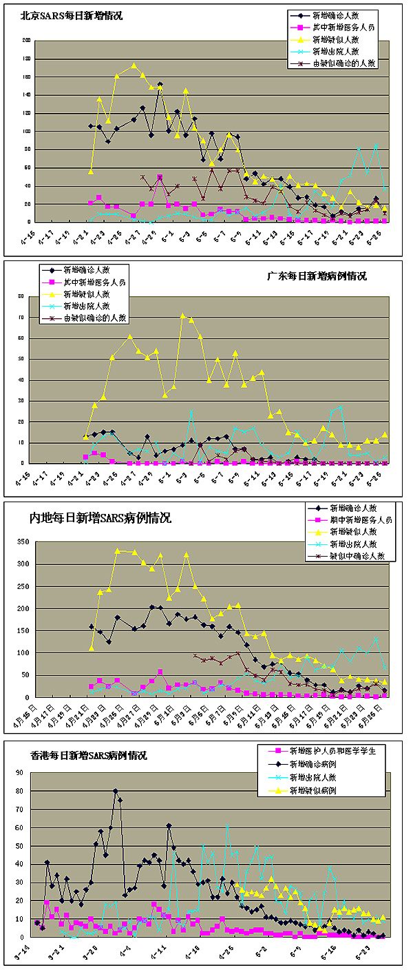 北京自3月1日收治第一例SARS病毒患者,3月份鲜为人知的众多医院内感染使我们错过了将危机消灭在其潜伏期的良机。从4月21日到5月初,每天新增病例和疑似病例都保持在100多人,疑似病例4月26日达173人,临床诊断病例4月29日达152人。如图所示,统计数据表明北京这段时间的疫情持续高发。进入五月,北京疫情出现明显的下降趋势,如果北京疫情发展持续时间也是一个月左右,就北京目前的情况看,北京疫情开始进入下降期,但还不完全具备衰退的迹象。