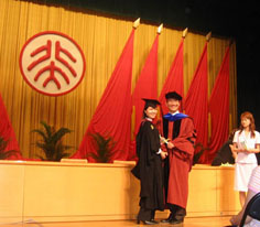作为中国经济研究中心的传统,每年毕业典礼都会有一位成功人士前来与毕业生分享其感悟。近期中国与世界各国的贸易谈判使此次毕业典礼的特邀嘉宾——中华人民共和国商务部部长薄熙来再次成为社会的焦点,这也同样为他此次的CCER之行带来了与众不同之处。由于公务繁忙,薄部长不得不抽出宝贵的时间前来参加毕业典礼,他为自己不能准时到场而提前请海闻教授转达了歉意,当他风尘仆仆刚刚在主席台就座,就利马走上演讲台,热情洋溢的向各位毕业生及其亲友问好,并发自内心的与在座各位分享了他的感触。首先,薄部长从亲身经历说起,在祝贺大家毕业的同时,也祝贺大家的“幸运”,遇到了一个前所未有的时代去学习自己喜爱的知识,发挥自己的才干。并祝贺大家有幸在中国经济研究中心遇到了一批在经济学理论和中国经济实践方面的顶级专家,尤其是像林毅夫教授一样拥有传奇个人经历和理想抱负的长者。但与此同时,薄部长同时从自己的工作内容出发,提醒大家这个时代同样充满了压力和挑战。它们不仅来自发展中国家的国情现实,同样来自高等教育发展的现状。但言语之间,薄部长亲和的笑容和翔实的生活事例,让在座的每一位毕业生看到了寄寓在自己身上的希望。最后,薄部长寄语每一位即将成为精英的毕业生勿忘个人理想与爱国热情。理想是必须的,爱国并不可怕,当外国人都开始对我们连连称赞时,我们自己更应该鼓足干劲,在新的时代机遇下,完成民族的复兴。薄部长一气呵成的演讲平实,真挚,赢得了长时间的热烈掌声。