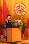 毕业生与教师先后在欢快的音乐声中入场。海闻教授简短的开幕辞后,林毅夫教授首先代表中国经济研究中心向毕业生及其亲友致词。无论是即将走出校园的双学位本科生、研究生,还是从职场重返校园后又将再次离开的BiMBA学员,这一时刻都将是他们人生的重要里程碑。被大家称为CCER及BiMBA“大家长”的林毅夫教授此时此刻不忘感谢那些毕业生的家长,是他们的启蒙和引导为这些出色毕业生的成长奠定了基础。林毅夫教授还不忘与大家分享在过去一年中,师生与工作人员共同取得的丰硕成果:“中国经济研究中心被评为教育部全国人文社会科学百所重点研究基地之一;中心主办的经济学双学位项目获得北大教学成果一等奖和北京市教学成果二等奖;中心主办的北大国际MBA接连在《财富》杂志和《福布斯》杂志的评比中名列全国第一。”他还告诉各位同学在离开北大之后,可以很骄傲地记住在中心的光荣榜上也有他们的汗水。但最为人难以忘怀的是林毅夫教授最后真诚的叮咛: