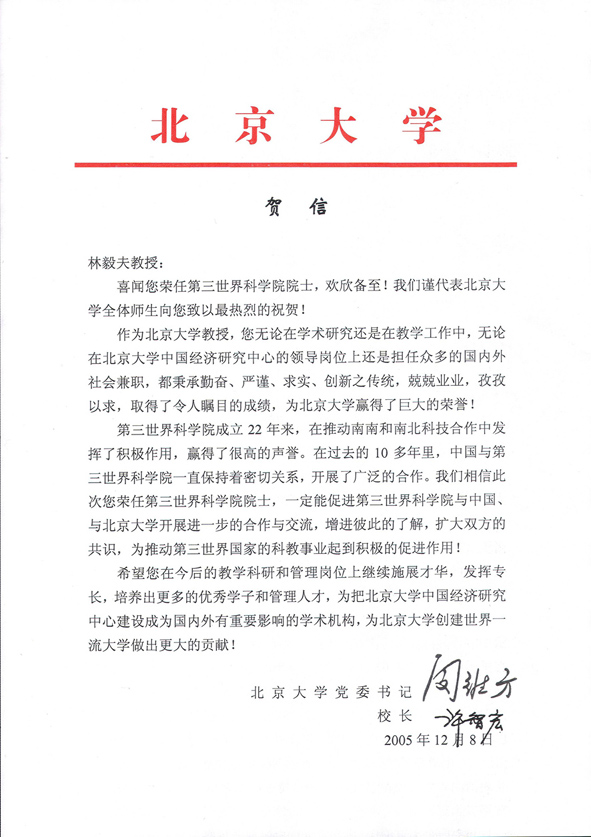 日前在埃及亚历山大举行的第三世界科学院第十六届全体大会上,中心主任林毅夫教授当选第三世界科学院院士。此次大会共有11位大陆科学家当选第三世界科学院院士。北京大学党委书记闵维方教授、校长许智宏教授给林毅夫教授发来了贺信。贺信如下: