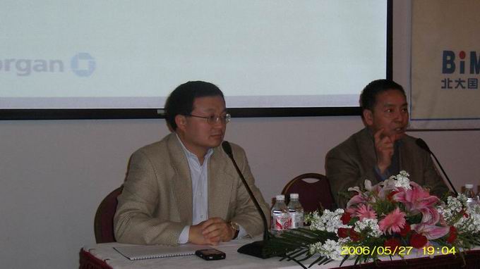 方总今天给我们做了非常精彩的演讲,今天参与的同志也非常踊跃,这个讲座是北大中国经济研究中心和北大国际MBA联合举办,摩根大通公司跟我们的系列讲座,今天是第二讲,下面还有三讲,从投行的角度,从中国金融市场和中国金融改革,包括外汇,宏观经济形势都有关系的讲座,我们的讲座大概延续到9月初。今天晚上出席讲座的同学,包括北大国际MBA的同学,包括北大中国经济研究中心的硕士生和商学院的同学,还有北大其他各个院系同学加入,提的问题都很专业,很深刻,也很具体,所以我们对大家的参与表示感谢。特别要感谢方总,方总曾是清华大学学生会的主席,所以他的领导能力很强,今天晚上的讲演可以显示他的领导能力、驾驭能力,对问题的反应都很出色,对于方总今天晚上的支持再次表示感谢。