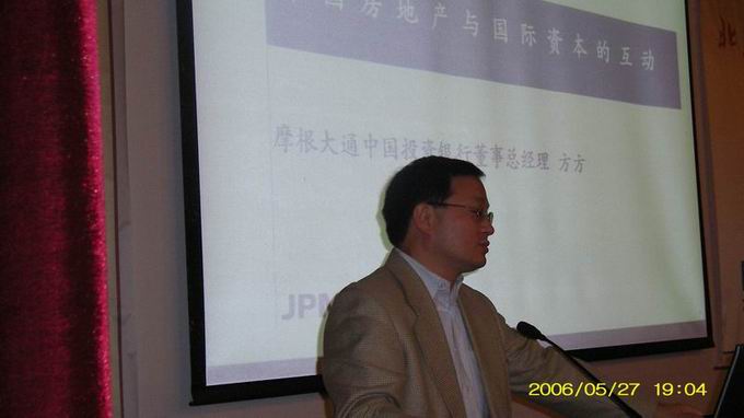 女士们,先生们,各位晚上好!今天非常高兴请到摩根大通中国投行部的董事总经理方方先生给我们做一个关于中国房地产与国际资本互动的题目的演讲,简单介绍一下方方先生的主要经历。方先生是清华大学1984年入学本科,1989年毕业于清华大学,获得工学学士,在美国拿了MBA,1993年开始在华尔街的美林做投行业务,做了8年,2001年他加入摩根大通的投行部,从2001年到现在短短不到5年当中,他所管理的摩根大通中国投行部做了大概十几项非常成功的投行业务,其中包括IPO,债券发行,包括配股,涉及到很多行业,比如说新疆航空,太平洋航空控股公司,涉及到国际薪酬公司的发行,涉及到东方集团,很多很多产业,他的经验很丰富,但是今天晚上讲的题目是关于房地产的。