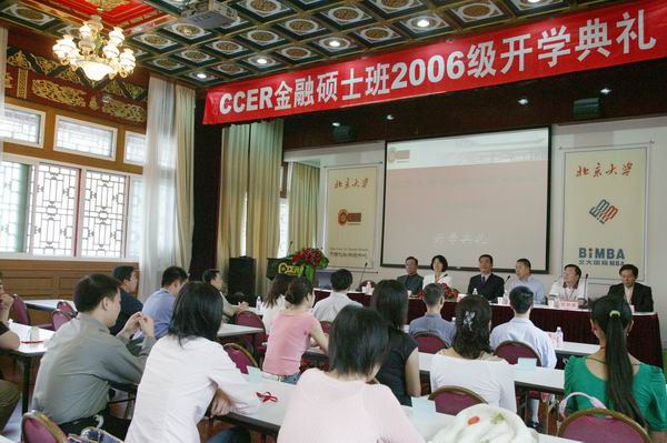 二零零六年九月十六日,北大中国经济研究中心金融硕士班在万众楼多功能厅隆重举行了2006级新生开学典礼。学员多来自国内各金融机构,同时也有从事媒体,法律等行业的朋友。会议由金融硕士项目主任平新乔教授主持,中心主任林毅夫教授,李玲教授,霍德明教授,巫和懋教授,汪浩教授,何茵教授,余淼杰教授,龚强教授均出席了本次会议。