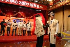 灯笼高挂,对联横中,在一片其乐融融的气氛中,中国经济研究中心2007元旦晚会拉开了序幕。第一个节目自然是中心每年的经典——老师的合唱,虽然没有伴奏带的配合,老师们高涨的情绪仍然感染了大家,一曲《我的中国心》唱出了每个人的心声。第二首歌从一开始一直处于保密状态,当老师们开口唱出时,每个人都叫了起来,原来老师们竟然也唱起了流行歌曲——super star!充分展现出中心的老师与时代紧密结合的特点,fashion不输大家呀!今年刚到中心的巫老师也携全家来到了晚会现场,并给大家献上了新年的祝福,巫老师的一句话道出了大家的心声:“中心让我感到很温暖……”。李玲老师随后也像大家介绍了每一级的学生,并像家长一样对每个年级的同学给予了殷切的期许和要求。