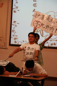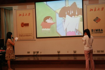 “曾经有一段美好的感情摆在我面前,我没有好好珍惜……”这段告白是每个年轻人都熟悉的名篇,此时此刻,却在中心余淼杰老师、岳大洲和乔攀同学的方言配音下,大放异彩,别具深意。第二个配音游戏是王惠和王敏瑶同学为《蜡笔小新》片段的精彩配音,两位同学的精湛演技极为惊人,同学们交口称赞,认为深得原版精髓,极为神似,她们的表演给同学们留下了深刻的印象,直至今日,她们的英姿亦未曾有稍许暗淡。晚会在此时已进行了约四分之三,万众楼中温暖如春,师生情绪高昂,气氛热烈,期待着下面更为精彩感人的情节。随后,来自台湾的张慧婷同学和其他几位同学在到场师生面前一展身手,比拼魔方,张慧婷同学以熟练的技艺仅用了一分多钟的时间将一个打乱的魔方拼好,赢得了到场同学的一片惊呼。