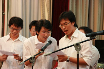 曾经在07年元旦晚会上风靡全场的“四大天王”在今年的中秋晚会上也到场了两位,一个扮起了周杰伦,另一个则自称是费玉清。在一曲悠扬的《千里之外》赢得了全场掌声的同时,主持人熊奕同学的点评“王非唱得多好啊,王雁杰唱得多敬业啊”也让大家忍俊不禁。随后,一支由博士生、硕士生、双学位和校友组成的合唱队伍与同学们一起分享了《童年》的故事。
