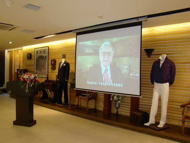 在创世旗舰店内,交流团首先观看了一段3分钟的视频,是巴菲特应李桂莲请求为今年9月大杨集团30周年庆典而摄制的视频。视频中,巴菲特盛赞创世西服让自己七十多年来首次被人夸奖帅气。他甚至不无玩笑地声称自己和比尔·盖茨应该开一家专卖店去销售大杨创世的西服,并戏称自己会是一名出色的推销员。据悉,李桂莲和巴菲特相识于两年前。当时巴菲特前往大连参加伊斯卡尔金属制品公司一家新工厂的开幕仪式,大杨创世的全球营销总监找到一个机会,建议巴菲特试试创世的定制西服。巴菲特与李桂莲的友谊就此开始。今年5月,巴菲特还特别邀请李桂莲作为特邀代表参加了他的伯克希尔·哈撒韦年度股东大会,并为她拉来了很多名人客户,其中甚至包括比尔·盖茨。现在,李桂莲的顶级名人客户有七十多个。