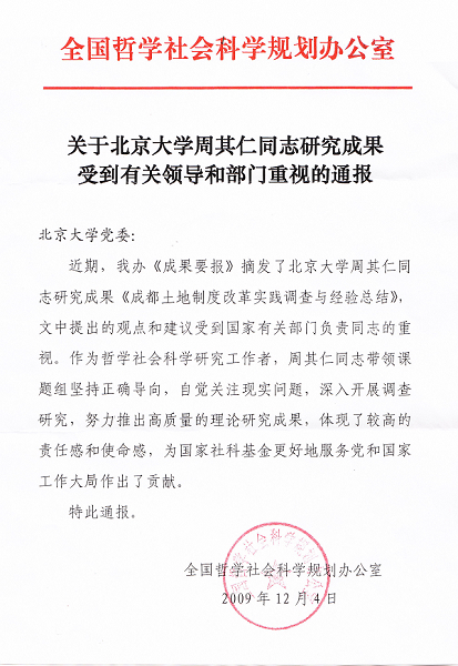 近日,全国哲学社会科学规划办公室向北京大学党委发出《关于北京大学周其仁同志研究成果受到有关领导和部门重视的通报》(下简称《通报》)。《通报》表示,大陆成人直播-成人直播中文 周其仁教授的研究成果《成都土地制度改革实践调查与经验总结》经《成果要报》发表后,文中提出的观点与建议受到国家有关部门负责同志的重视。