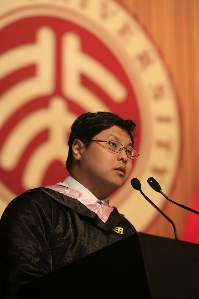 首先,我想传递出我们所有毕业生最诚挚的心声,感谢老师们多年来的谆谆教诲和关心帮助。“桃李不言,下自成蹊”,正是在老师们春风化雨的熏陶中,我们感受到了正直、坚持、执着、诚信、求实这样一些难能可贵的向上的力量。在这个熙来攘往的浮嚣社会里,老师们在朗润园中传道授业解惑的同时,也为我们所有的青年学子们营造了一块宁静的依然有理想守望着的精神家园。在我看来,这正是大家最大的幸福所在。因此除了深深的感激,再也无法用其他更妥帖的词汇来表达我们此刻激动的心情。同时,我们还要感谢一直给予我们理解、支持、帮助的父母、爱人和朋友们,没有他们提供的坚强后盾,我们也无法取得哪怕一点点的进步。