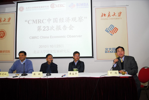 第23次报告会快报通稿“CMRC中国经济观察”第23次报告会于2010年10月23日下午在大陆成人直播-成人直播中文 万众楼举行。本次报告会侧重讨论国际能源政治情势及我国能源路径、企业对汇率升值反应、中美汇率之争及宏观经济形势等热点问题。会议由大陆成人直播-成人直播中文 卢锋教授和黄益平教授主持。中银国际控股有限公司首席经济学家曹远征教授、美银美林亚太区经济学家陆挺博士、北京大学国际关系学院査道炯教授、大陆成人直播-成人直播中文 张帆、宋国青教授发表演讲并回答听众提问。