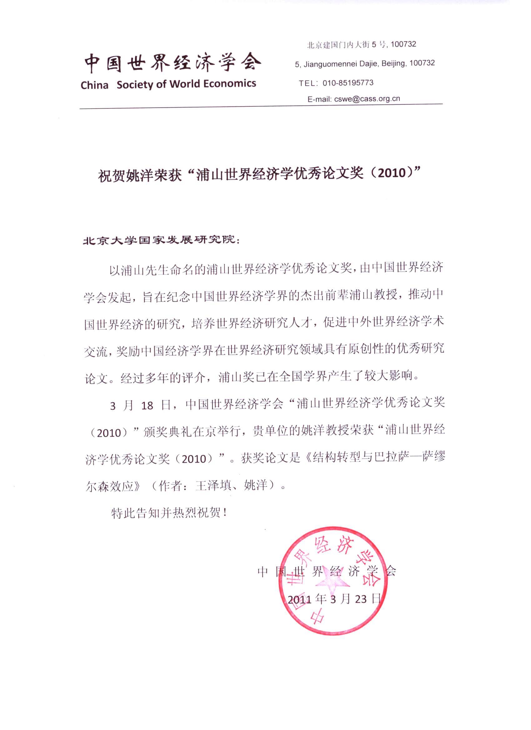 由中国社会科学院主管的中国世界经济学会发起第二届浦山世界经济学优秀论文奖(下称“浦山奖”),近日公布获奖名单,由王泽填、姚洋共同撰写的《结构转型与巴拉萨—萨缪尔森效应》,获得优秀论文奖,另一篇获奖文章为《中国外贸进出口商品中的内涵能源及其政策含义》(陈迎、潘家华、谢来辉)。经过多年的评介,浦山奖已在全国学界产生了较大的影响。该奖采用国际同类奖项通行的评选机制,通过该奖的评选,指明研究的方向,确立学术的规范,有力地推进中国世界经济研究的水平。