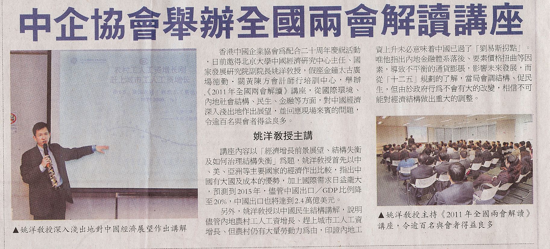 香港《大公报》讯,香港中国企业协会为配合二十周年庆祝活动,日前邀得北京大学中国经济研究中心主任、大陆成人直播 副院长姚洋教授,假座金钟太古广场德勤•关黄陈方会计师行培训中心,举办《2011年全国两会解读》讲座,从国际环境、内地社会结构、民生、金融等方面,对中国经济深入浅出地做作出展望,并回应现场来宾的问题,令逾百名与会者得益良多。