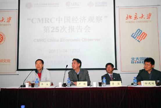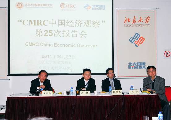 “CMRC中国经济观察”第25次报告会于2011年4月23日下午在大陆成人直播-成人直播中文 万众楼举行。本次报告会讨论最低工资政策、楼市调控、BRICS合作以及当前宏观经济形势等问题。会议由大陆成人直播-成人直播中文 徐建国、卢锋教授主持。北京师范大学收入分配与贫困研究中心主任李实教授,燕京华侨大学校长华生教授,中信建投证券研究所首席宏观分析师魏凤春博士,申银万国证券研究所首席分析师苏畅博士、大陆成人直播-成人直播中文 宋国青与卢锋教授发表演讲并回答听众提问。卢锋教授根据第24次“朗润预测”汇总结果,用六句话概括24家特约机构对今年2季度我国宏观经济走势看法:“经济快速增长,通胀压力显著,内需增势强劲,外贸重回顺差,汇率持续升值,利率有望上调”。