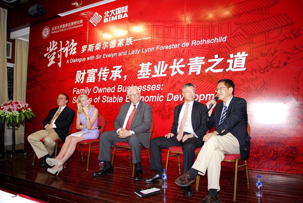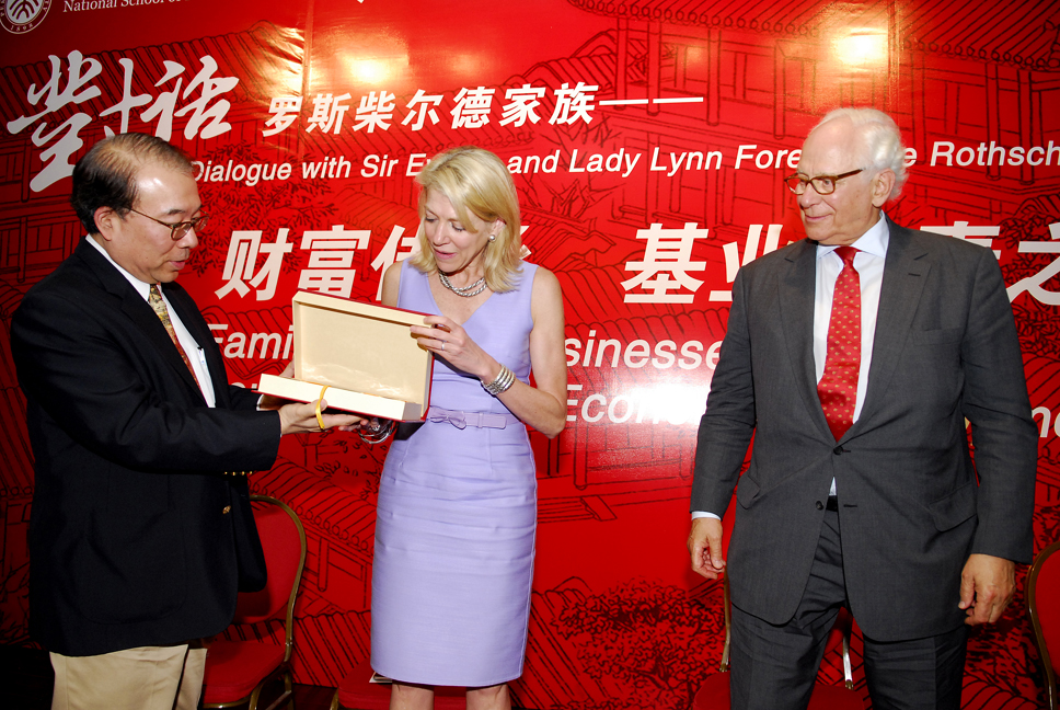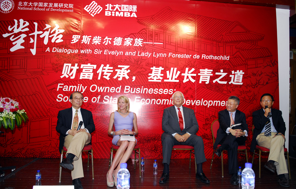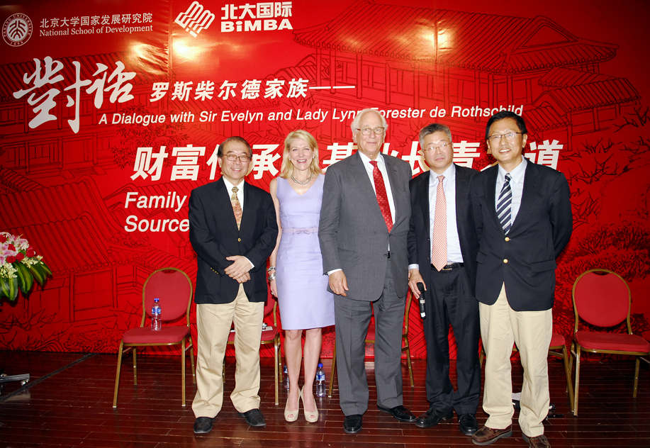 6月7日下午4时,罗斯柴尔德家族第七代掌门人伊夫林•罗斯柴尔德爵士(Sir Evelyn de Rothschild)和琳•罗斯柴尔德夫人(Lynn Forester de Rothschild)与北大大陆成人直播 教授霍德明先生,经济学人集团中国首席代表、经济学人信息部中国咨询总监许思涛先生一起,在北京大学朗润园万众楼二层展开对话。本次对话由大陆成人直播 教授杨壮主持,此次演讲主题是“财富传承,基业常青之道”。现场吸引了包括北大师生、校友在内的200余名听众到场。