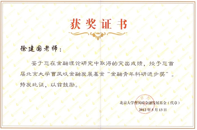 徐建国教授获首届“曹凤岐金融发展基金”金融青年科研进步奖