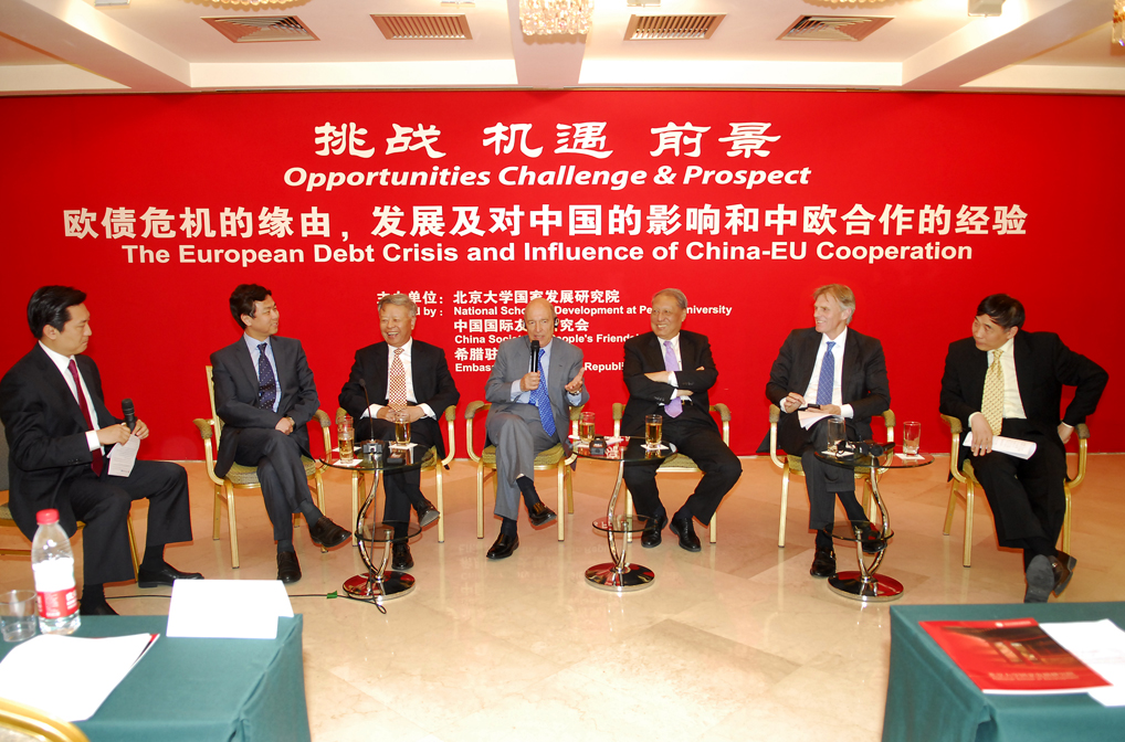关于欧债危机的根源和解决问题,几位专家表达了自己的意见。卢峰教授认为主要有三个原因,一是政府过度支出,二是单一货币体系下的外部失衡,三是欧元一体化战略选择这一设计在日后的影响。金立群先生强调各国应当调整货币政策来解决债务问题,例如财政转移。西米蒂斯总理表示,一个方案不能解决所有问题,希腊国内也有民众认为如果欧盟不能提供一个宽松的环境,虽然代价惨痛,但希腊将不得以选择离开欧元区。成思危先生接着讲述了自己的观点,希腊退出欧洲货币联盟并不见得可以解决本国的危机,因为希腊并不是一个出口大国,利用货币的贬值难以获得利益,反而不利于本国的进口。另一方面,希腊不应让福利政策绑架货币政策。从国际环境来讲,欧元区的政治一体化将有利于欧洲南部国家更快走出危机。