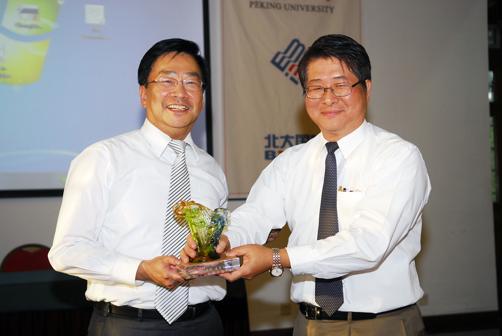 向台湾中央研究院经济研究所赠送礼物,彭信坤教授代表台湾中央研究院经济研究所回赠礼物。