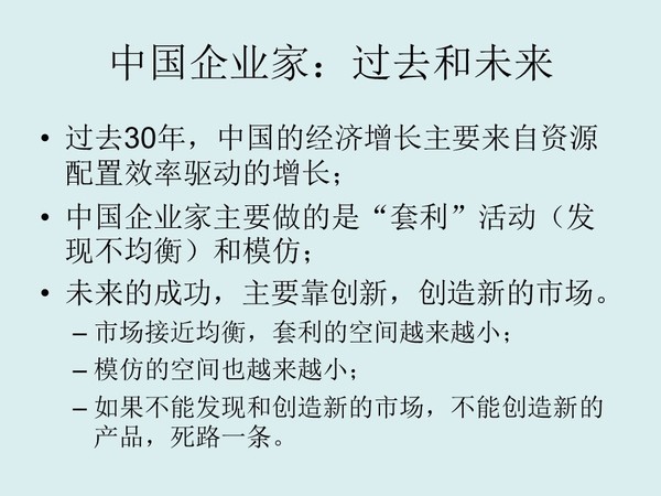 现在套利空间越来越小,创新变得越来越重要。未来的成功,主要靠创新,创造新的市场。为什么套利空间越来越小?因为市场接近均衡,模仿空间也越来越小。一种说法是,我们30年走过西方200多年的道路。我们比他们伟大吗?不是。我们拿人家的东西过来,这是一个套利,国际市场的套利。