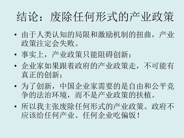 由于人类认知的局限和激励机制的扭曲,产业政策注定会失败。如果企业家跟着政府的产业政策走,就不可能有真正的创新。为了创新,中国企业家需要的是自由和公平竞争的法治环境,而不是产业政策的扶植。所以我主张废除任何形式的产业政策,政府不应该给任何产业、任何企业吃偏饭。
