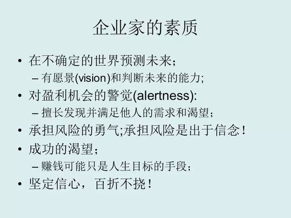 创新型企业家的素质包括,在不确定的世界预测未来;对盈利机会的警觉;承担风险的勇气;对成功的渴望,以及坚定的信心。