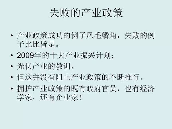 产业政策成功的案例凤毛麟角,失败的案例则比比皆是,看看2009年的十大产业振兴计划,前一段光伏产业的教训,以及下一步的汽车新能源政策。尽管如此,也没有阻止产业政策的不断推行。