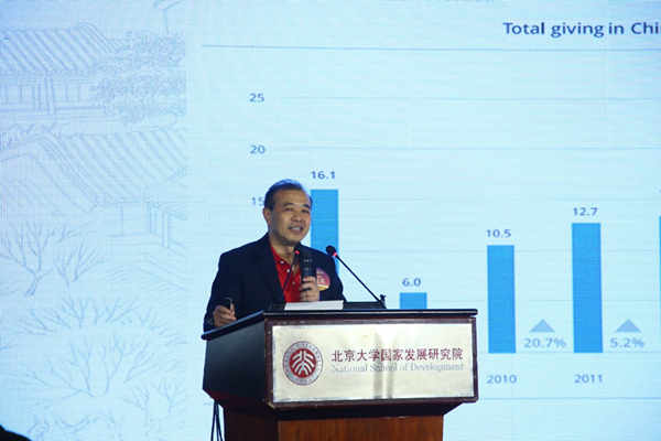 全体大合影之后,北大国发院校友公益委员会学术会长、北大国发院王超教授发表了题为“新公益·新机遇”的主题演讲。他首先介绍了中国新公益时代下商业与公益的融合、影响力投资、互联网+公益、社会创新等方面的情况。接着,他分析了国发院在新公益时代做公益的优势和机遇。他认为,国发院有严谨的学风和厚重的文化底蕴,有国际化、跨学科、多领域的国家发展主题背景,有理论结合实践、践行经世济民的理念指引,以及强大的校友资源和人才集聚。未来,国发院公益可以把新公益行动学习与倡导,政策创新实验与建议,新公益领导力开发,以及公益创新项目案例实验这四个层面作为战略发展方向。希望大家可以携手走进国发院的新公益时代。