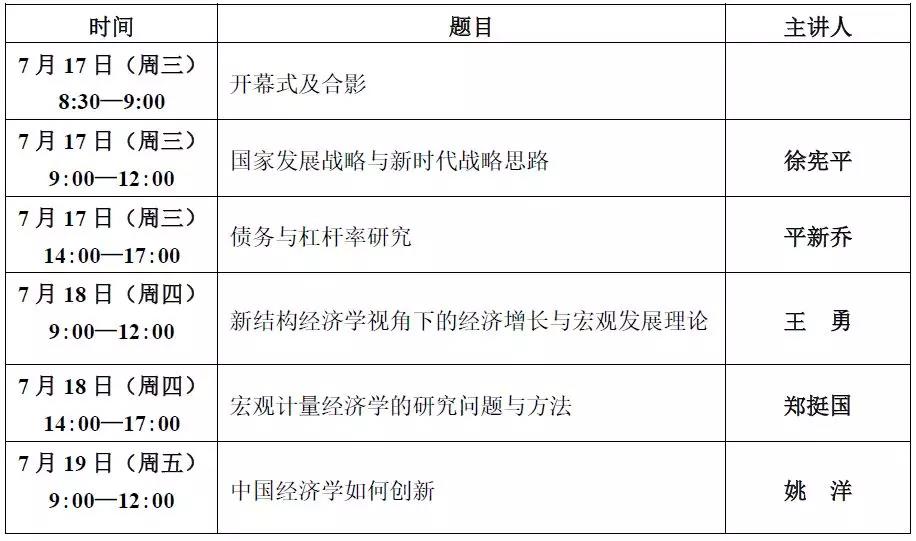 此次培训班的主题是“后危机时代的宏观经济学研究与教学”,我们邀请了来自宏观经济领域的五位知名专家——徐宪平、平新乔、王勇、郑挺国、姚洋,他们将分别从宏观政策、宏观计量、前沿和本土研究等不同角度,分享自己的研究和教学心得。与会教师可以通过嘉宾主题演讲、课上互动、课下沟通等方式与主讲嘉宾及其他参会老师进行交流,提升自己的研究水平。