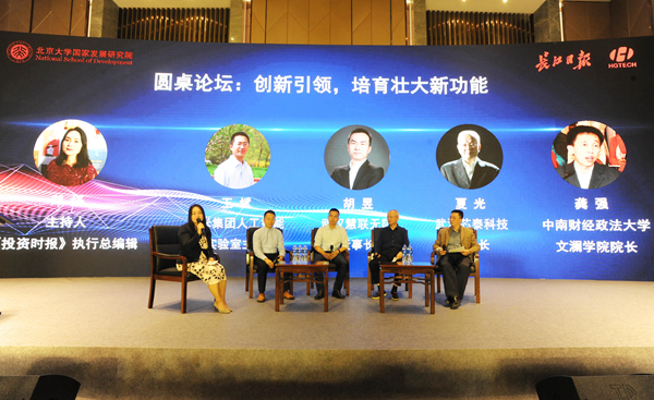 论坛最后是圆桌论坛,由《投资时报》执行总编辑邓妍主持。小米集团人工智能实验室主任王斌,武汉慧联无限科技有限公司联合创始人兼董事长胡昱,武汉芯泰科技有限公司董事长夏光,中南财经政法大学文澜学院院长龚强等一起上台参与,在主持人点将下,大家聚焦“创新引领,培育壮大新动能”展开讨论。