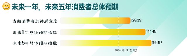 今年上半年中国消费者信心指数显示,当期消费者总体满意指数为128.39,未来一年的总体预期指数为144.45,未来五年总体预期指数为155.97。