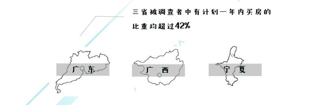 报告数据显示,有37%的被调查者认为未来一年内自己有可能买房。分地区看,南部地区有40.8%的被调查者有意向买房,其中来自广东、广西两省的被调查者中有近42%的消费者有买房打算。在非南部地区,来自宁夏回族自治区的被调查者有意向近期购房的比例也相对较高。