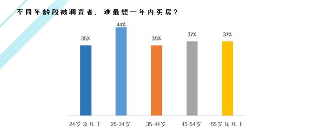 分性别看,36%男性倾向于一年内买房,有同样计划的女性比重略高,达到38%。从年龄段来看,85后(25-34岁)最倾向于近期买房,有44%的被调查者计划在一年内买房。