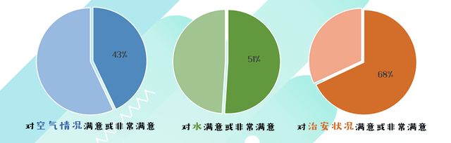 今年上半年的报告数据,也体现了类似趋势。在13个细分领域中(今年调查的领域有所调整,从去年的10个领域增加到13个领域。),“对当下所在地环境的满意度”仍是倒数,有43%的被调查者对所在地空气情况“满意”或“非常满意”;51%的消费者对水满意;68%的消费者对社会治安呈满意态度。