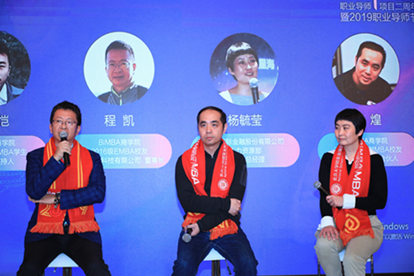 接下来,来自北京海特科技有限公司的EMBA2016级校友程凯,金瓴创投创始合伙人、2001级全日制MBA校友李煌和中国国际金融股份有限公司人力资源部前董事总经理杨毓莹,分别畅谈了商学学习给自己人生带来的改变。作为导师,他们也对青年学生的未来职业道路选择给出了中肯建议。