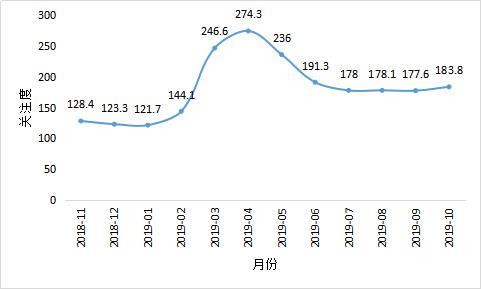 关注度指数反映了投资者的活跃程度。2019年10月投资者关注度指数为183.8,较2019年8月的177.6略微上升了6.2,大致呈现持平走势。本月上证综指在2900到3100之间呈现窄幅震荡走势,市场活跃度较平稳(图1)。