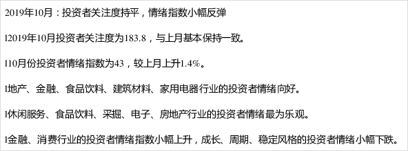 本月投资者关注度指数较上月基本保持不变,存在筑底迹象。从投资者情绪来看,受中美贸易问题取得实质性进展、英国退欧不确定性以及国内通胀等因素影响,本月投资者情绪指数持续上月反弹势态,但反弹幅度有限。从板块角度来看,创业板、上证50和中小板较上月均有不同程度的反弹,中证500小幅回调。就行业而言,10月份地产、金融、食品饮料、建筑材料、家用电器等行业的投资者情绪指数表现最好。从风格来看,金融、消费风格的投资者情绪指数较上月小幅上升,成长、周期、稳定小幅下跌。总体来看,中美贸易问题得到缓解,投资者情绪得到一定的提振,但市场对全球经济前景的担忧和英国脱欧进程曲折,以及国内投资者对经济滞胀的担忧一定程度上影响了情绪走势。