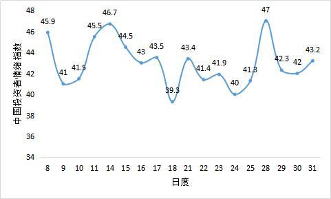 图2.2019年中国投资者情绪月度指数就日度投资者情绪指数来看,本月投资者情绪指数最低值为39.3,最高值为47,月初和月末振幅较大,整体呈现窄幅震荡走势,未见明显分歧走势(图3)。