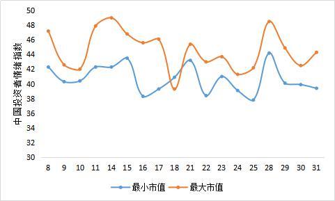 图3.2019年10月中国投资者情绪日度指数进一步将沪深300指数的成分股按照市值大小分为10等份,我们分别计算最大市值股票组和最小市值股票组的情绪指数,并给出最大市值股票组和最小市值股票组的情绪指数走势(图4)。2019年10月,最小市值组投资情绪和最大市值组投资者情绪均呈现窄幅震荡走势,在大部分交易日两组走势大致相当。虽然最小市值组股票情绪指数值依然处于最大市值组股票下方,即蓝筹股的投资者情绪比小市值股票更乐观,但总体来看小市值股票与蓝筹股的投资者情绪差异在缩小。