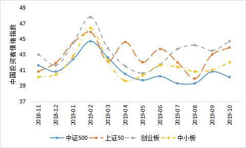 2019年10月,创业板投资者情绪指数为44.7,较上月上升了2.8%,为本月上升幅度最大的板块;中小板投资者情绪指数为42,较上月上升了2.4%;上证50投资者情绪指数为43.9,较上月上升了2%;中证500投资者情绪指数为40.1,较上月小幅下跌了1.7%,为本月唯一下跌的板块(图5)。