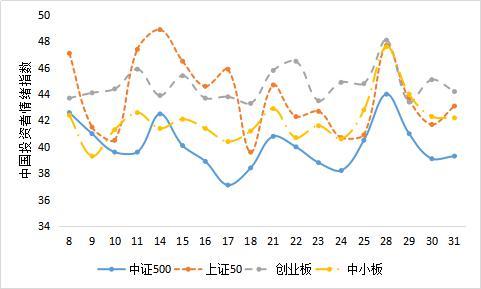 图5.2019年中国投资者情绪板块子指数各大板块单日情绪指数显示,本月各大板块情绪指数整月表现出震荡走势,上证50投资者情绪指数波动明显,创业板投资者情绪指数整体较高,中证500低于其他板块。本月各个板块投资者情绪指数大致在37-49之间震荡,振幅区间较大,但趋势相对平稳,未出现明显上升或者下降的单边走势(图6)。