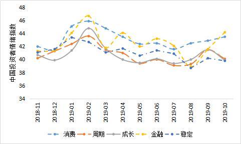 2019年10月,投资者情绪指数按风格排序分别是金融(44.2)、消费(43.5)、周期(40.1)、成长(39.9)、稳定(39.8)。金融风格的投资者情绪指数较上月上升明显,消费风格投资者情绪指数较上月小幅上涨。周期、成长、稳定较上月小幅下降。整体而言,本月不同风格的投资者情绪指数分歧较大(图8)。