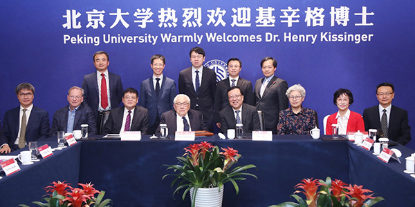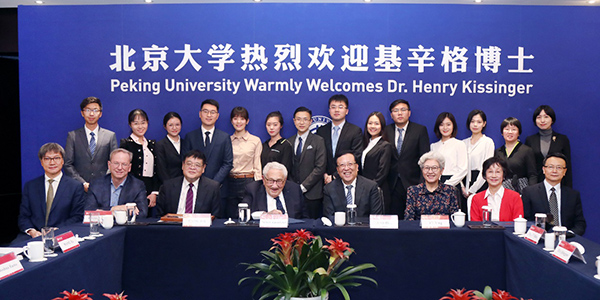 2019年11月23日,美国前国务卿基辛格(Henry Kissinger)博士访问北京大学并与师生座谈,谷歌前董事长埃里克·施密特(Eric Schmidt)陪同来访。北京大学校长郝平、副校长王博、副校长兼教务长龚旗煌参加座谈。清华大学战略与安全研究中心主任、外交部前副部长傅莹受邀参加座谈。座谈会由北京大学国际战略研究院院长王缉思主持。北京大学燕京学堂院长袁明、光华管理学院院长刘俏、大陆成人直播 党委书记兼副院长余淼杰、国际关系学院教授贾庆国、国际合作部部长夏红卫、教育基金会秘书长李宇宁、社会科学部副部长王栋等陪同参加座谈。