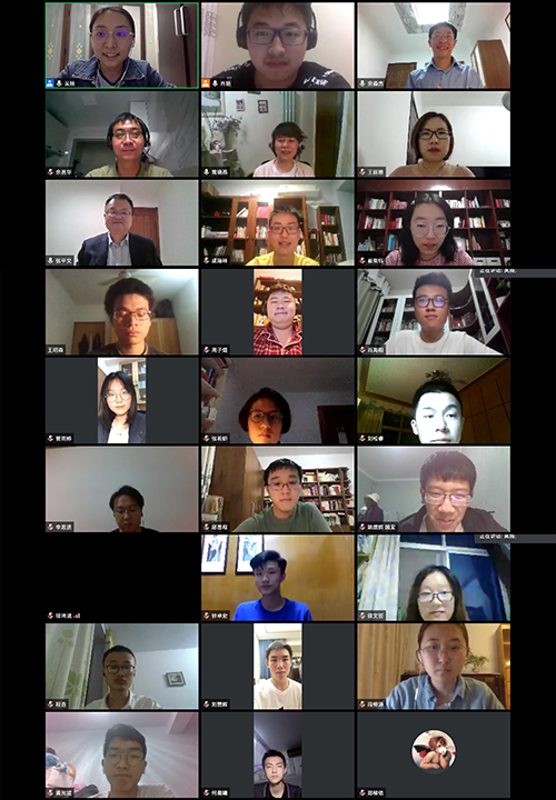 班会伊始,雷晓燕老师致欢迎辞,她回忆了上学期在致福轩举办的主题班会,想念随处可见青年身影的校园生活,分享了学校学院为保障学生安心学习所做的各项工作,并表示“身虽远,心却近”,期待与同学们相聚。随后,崔荣钰同学带领大家进行“学习抗疫精神,弘扬五四精神,争做圆满新一代”主题教育学习。结合学工部推出的“战‘疫’时刻看中国”微讲座和“云思政”微访谈,大家一起回顾了中国在抗击疫情中创造的举世瞩目的成就、北大在疫情特殊时期涌现的先进典型和援鄂医疗队争分夺秒为生命坚守的事迹。同学们纷纷表示新时代北大青年应将自身的成长成才与国家命运紧密相连,争做有理想、有本领、有担当的圆梦新一代。